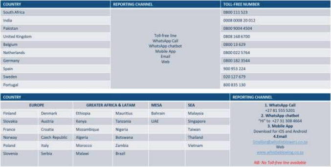 The purpose of this policy is to provide a formal, confidential channel to enable employees and external parties, to report in good faith, serious concerns of an Incident and/or wrongdoing that could adversely impact the Company and its subsidiaries, its employees, clients, customers, shareholders, investors or the public at large without fear of being subject to detrimental action. Furthermore, the policy provides a means by which employees can raise legitimate concerns with the appointed service provider, Whistle Blowers (Pty) Ltd, where they have reasonable grounds for believing that there is wrongdoing within the Company. This Policy is consistent with and aligned to the Company’s corporate values and its Code of Conduct. The process is hence intended to address organisational accountability, transparency, and individual responsibility by encouraging individuals to report wrongdoing such as, but not limited to fraud, corruption, extortion, sabotage, asset misappropriation, harassment, victimisation, discrimination and abuse of authority.3. SCOPE